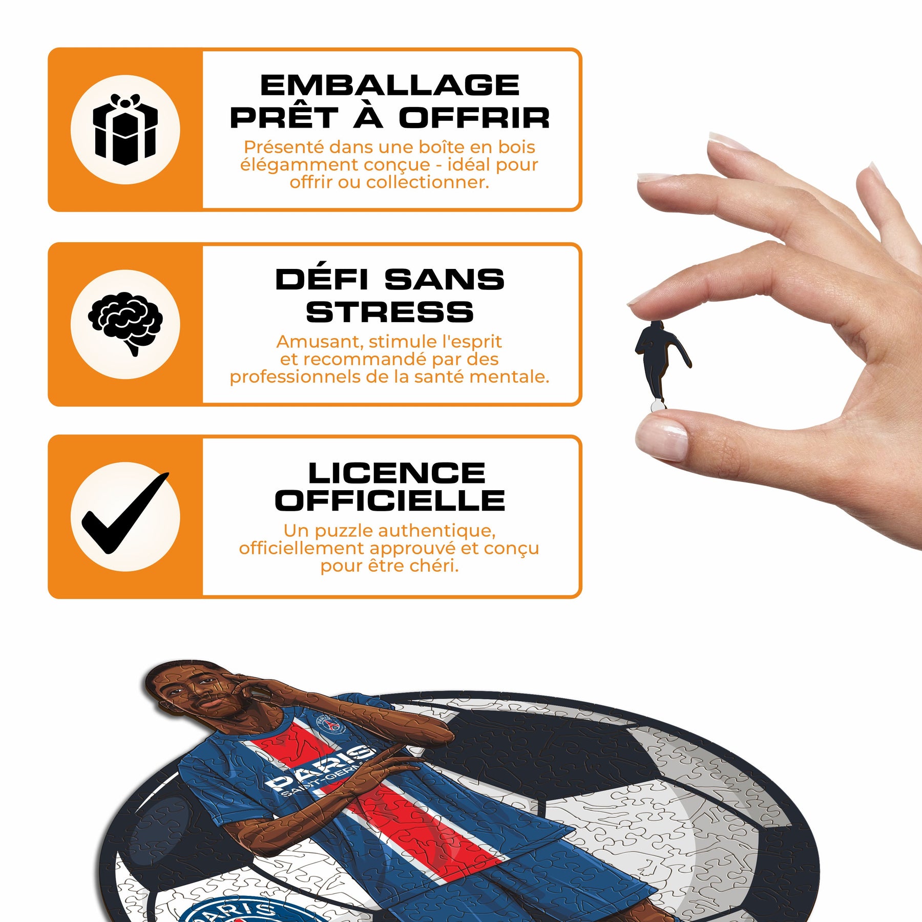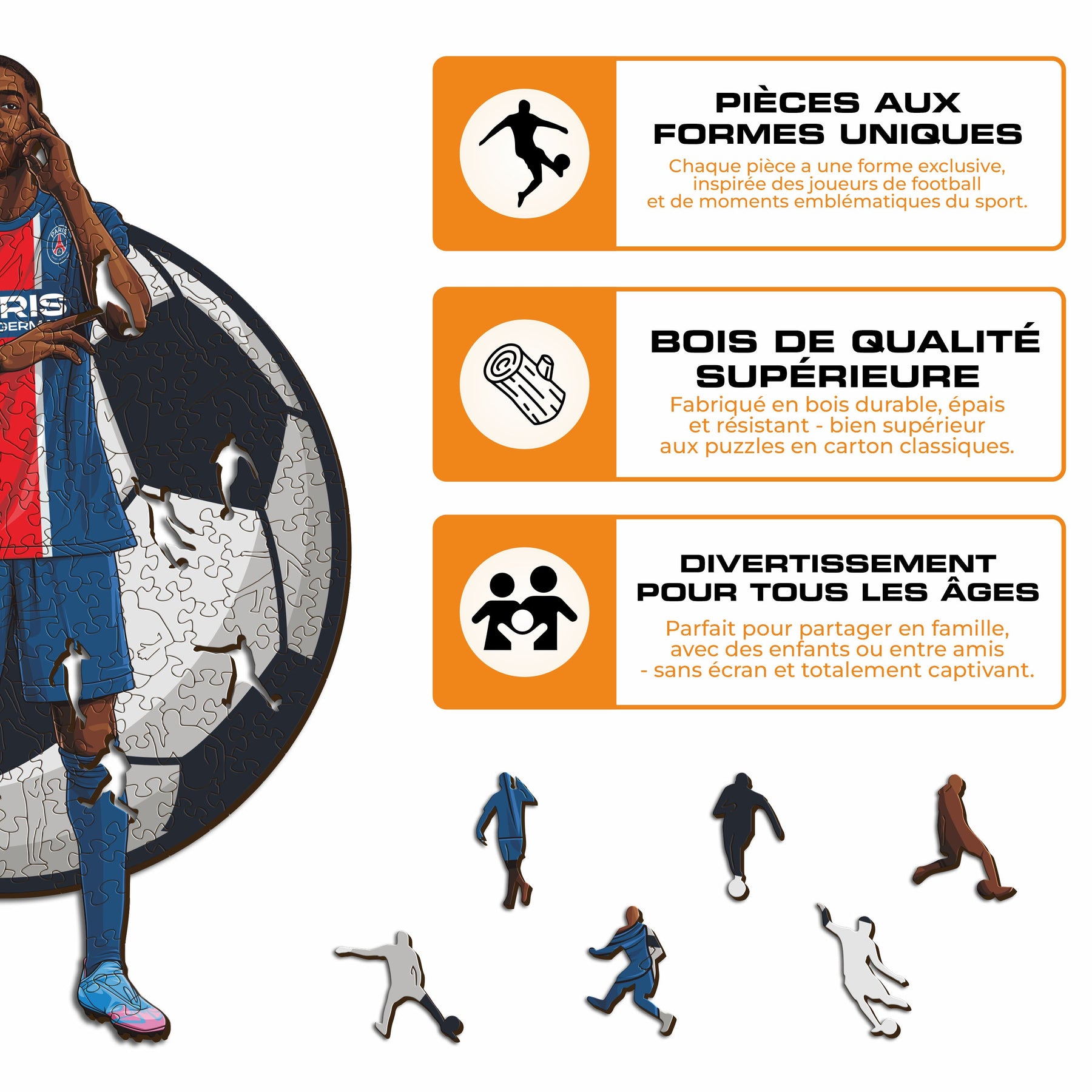 Nos puzzles sont pensés comme de vraies pièces de collection pour fans de foot : bois épais, découpe précise et visuels de clubs/joueurs iconiques. On ne fait pas “juste un puzzle”, on reconstruit son club ou son idole, puis on peut l’encadrer et l’accrocher dans la chambre ou le salon. Résultat : l’enfant (ou l’adulte fan) a autant plaisir à le monter qu’à le garder en déco.